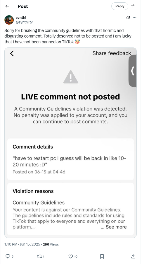TikTok censors user comment: An X user shared a screenshot of a censorship notice from TikTok regarding their comment, "have to restart pc I guess will be back in like 10-20 minutes :D." The platform flagged the comment, stating, "A Community Guidelines violation was detected. No penalty was applied to your account, and you can continue to post comments." However, TikTok did not specify how the comment violated its guidelines and withheld the comment from being posted.