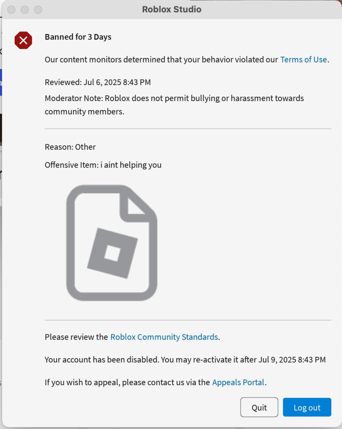 Roblox bans user for refusing to help another user: An X user shared a screenshot of his Roblox censorship notice. The user had posted "i aint helping you." Roblox claimed this violated its Terms of Use, stating that "Roblox does not permit bullying or harassment towards community members." The user's account was banned for 3 days.