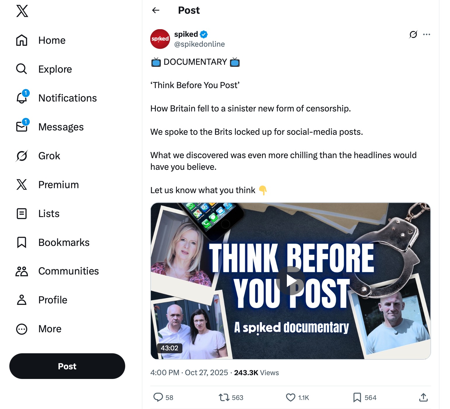 Age restrictions place significant limitations on social media content. Such measures require users to sign in before viewing the content, which also prevents the content from being embedded on external websites. Such posts are also not receiving the algorithmic boost that unrestricted posts enjoy. In short, age restricting this documentary limits its reach, thus ensuring fewer people learn about the U.K.’s deplorable censorship practices.