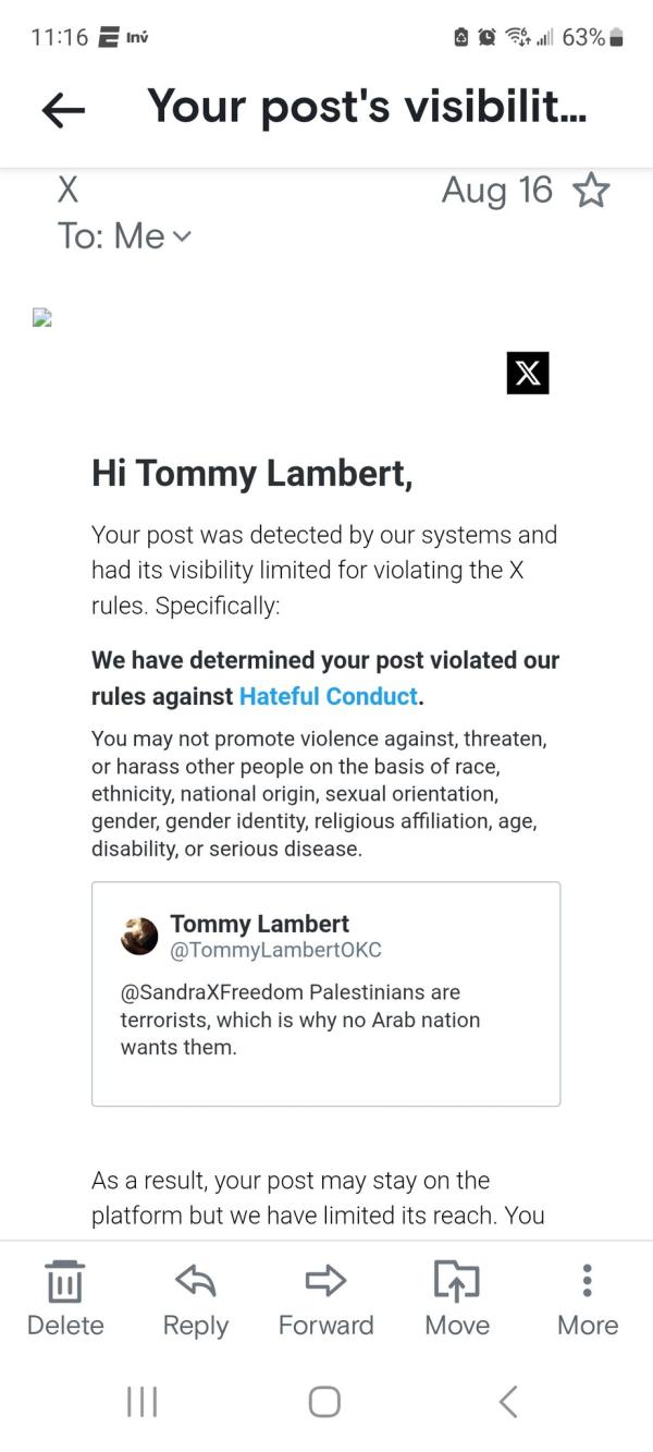 X censors user's post about Palestine: An X user shared a screenshot of the censorship notice sent by X. The user had posted "Palestinians are terrorists, which is why no Arab nation wants them." X flagged the post, stating that its visibility had been limited because it "violated our rules against Hateful Conduct."