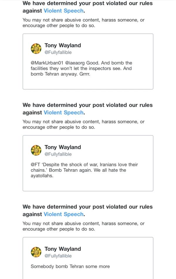 X censors user's posts encouraging the U.S. to bomb Iran: An X user shared screenshots of his censorship notices. The user posted several times about the same topic. "Good. And bomb the facilities they won't let the inspectors see. And bomb Tehran anyway. Grrr." "'Despite the shock of war, Iranians love their chains.' Bomb Tehran again. We all hate the ayatollahs." "Somebody bomb Tehran some more." According to X, these posts all violated its "rules against Violent Speech." The posts were deleted.
