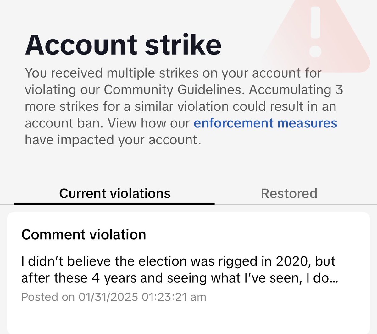 TikTok censors user for comment about her opinion on election: An X user shared a screenshot showing the current violations on her TikTok account that led to account strikes. The user had made a comment that read, in part, "I didn't believe the elections as rigged in 2020, but after these 4 years and seeing what I've seen, I do..." According to the screenshot, TikTok issued a comment violation for the comment that resulted in the comment being deleted and an account strike being issued. The user was alerted that "3 more strikes for a similar violation could result in an account ban."
