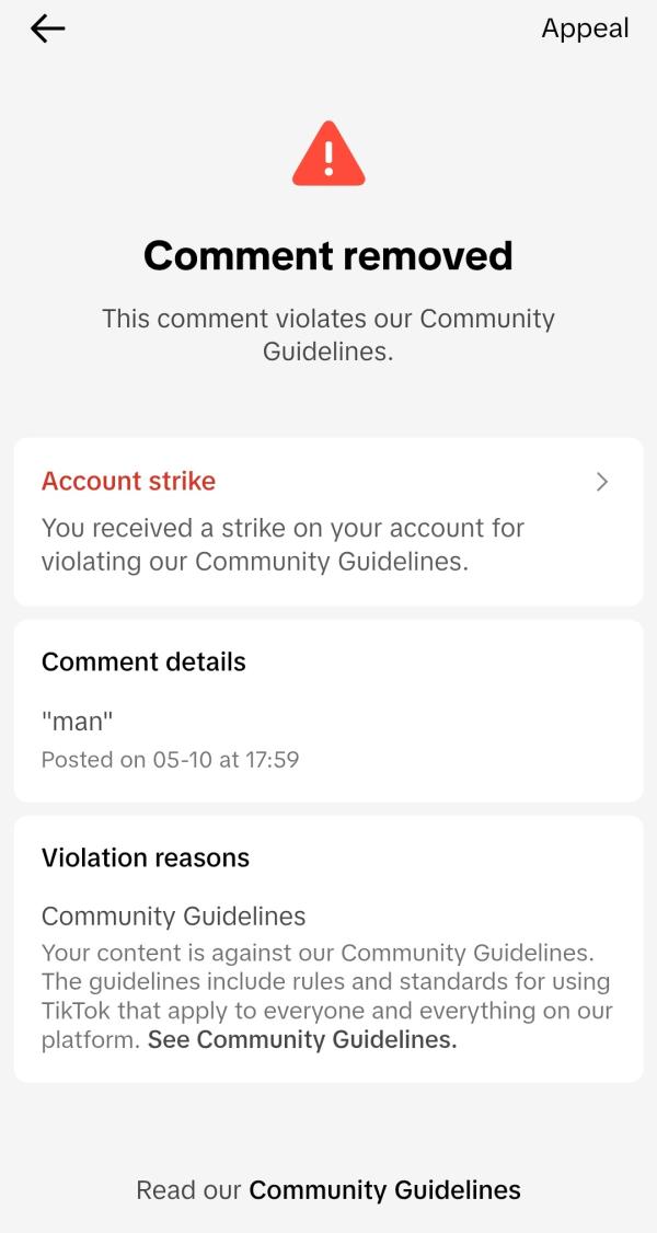 TikTok removes single-word comment: An X user shared a screenshot of a censorship notice sent by TikTok. The user on TikTok had commented "man" on a video featuring so-called transwoman Marcy Rheintgen. As a result of this comment, TikTok informed the user that the comment violated its Community Guidelines and the platform had deleted the comment. Further, TikTok applied a strike to the user's account.