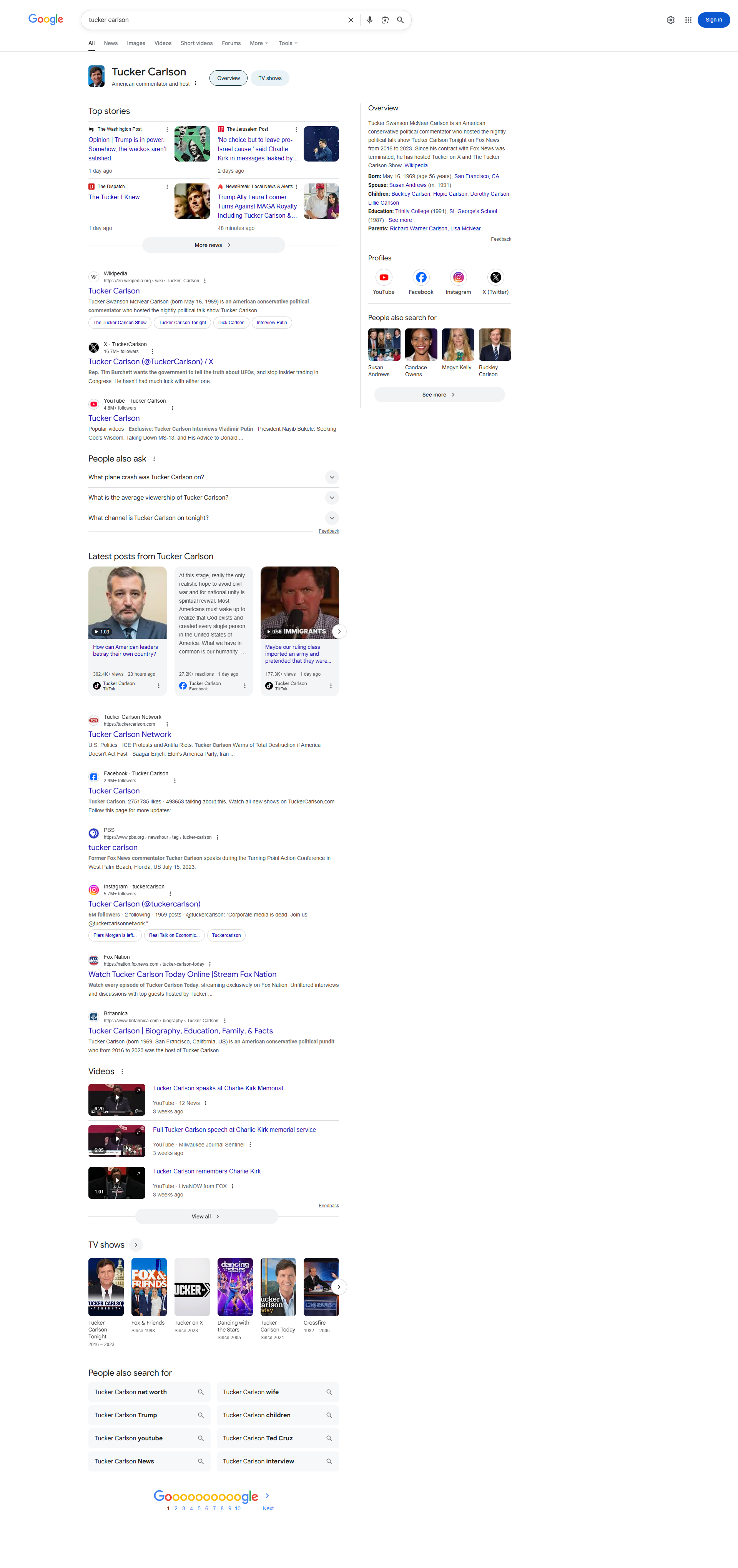 Google suppresses relevant and neutral results for Republican media figures: Multiple MRC Free Speech America (MRCFSA) studies have exposed how Google has suppressed right-leaning websites in search. MRCFSA researchers conducted a Google search for the words "Tucker Carlson" on October 20, 2025 to find the podcaster and former Fox News host's profile or a link to his website or news outlet. The first page of search results that Google displayed prioritized articles from leftist outlets about Carlson and his Wikipedia profile above his X and YouTube accounts, thereby suppressing his own changes to the 7th result and lower. According to data from Backlinko's analysis, these results get no more than a 3.9 percent click-through rate, while the top result receives more than 27 percent.