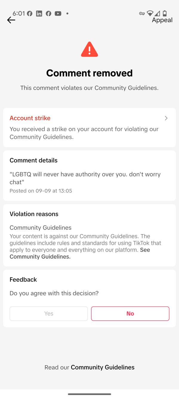 TikTok removes comment about LGBTQ: An X user shared a screenshot of his TikTok censorship notice. The user had posted "LGBTQ will never have authority over you. don't worry chat." TikTok removed the comment, citing only that it went "against our Community Guidelines."