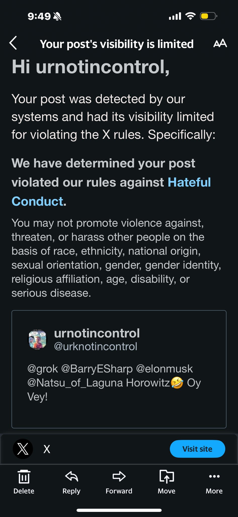 X censors user's post of a Jewish expression: An X user shared a screenshot of the censorship notice sent by X. The user had posted "Horowitz [crying laughing emoji] Oy Vey!" X flagged the post, stating that its visibility had been limited because it "violated our rules against Hateful Conduct."