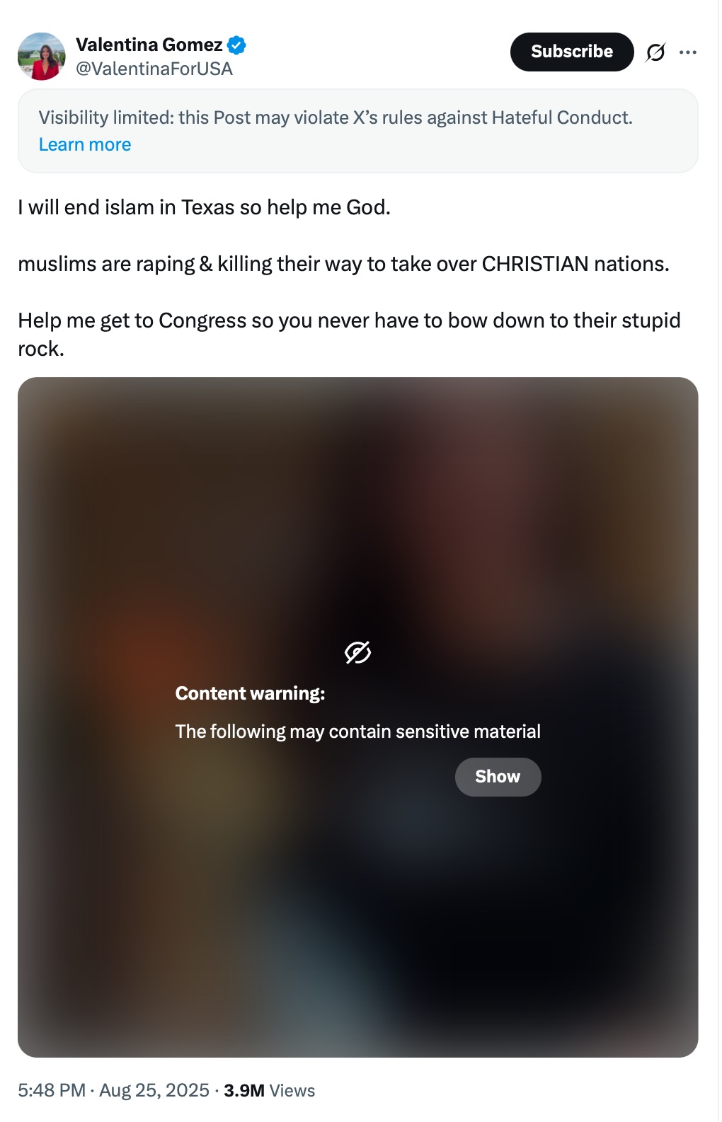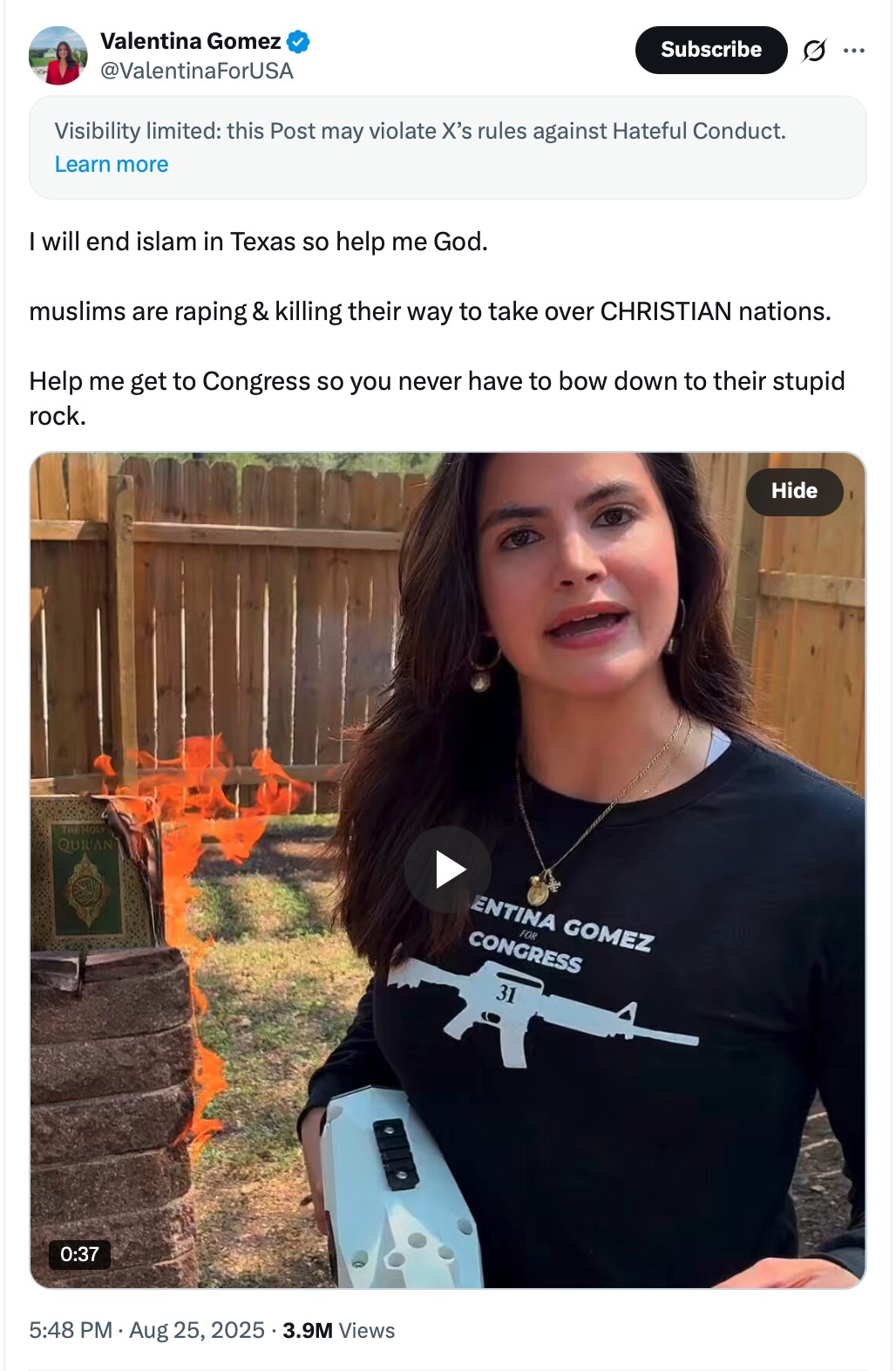 X censors post from Congressional candidate: Congressional candidate Valentina Gomez added a post to her X account that contained a video in which she used a flamethrower to torch a Quran. The text of her post read "I will end islam in Texas so help me God. muslims are raping & killing their way to take over CHRISTIAN stations. Help me get to Congress so you never have to bow down to their stupid rock." X placed a sensitive content filter over the graphic. Such filters do not allow users on the mobile app who have the sensitive filter enabled on their profile, the default setting, to view the filtered content at all. On the web version of X, the users must click through the sensitive content interstitial in order to view the filtered content. Not only do such filters give the impression of inappropriate content, similar filters have been shown to reduce user interaction with content.