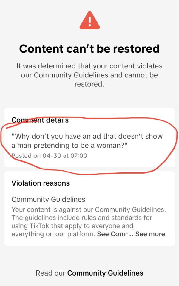 TikTok removes user's comment about transgenderism: An X user shared a screenshot of their TikTok censorship notice. The user had commented on another post saying "Why don't you have an ad that doesn't show a man pretending to be a woman?" According to the screenshot, TikTok removed the comment for violating its Community Guidelines, but did not specify how the comment violated the rules.