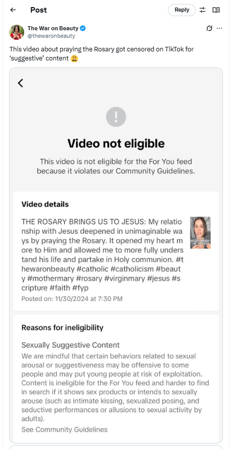 TikTok censors user's video: An X user shared a screenshot of her TikTok censorship notice. The user posted a video sharing her thoughts on how praying the Rosary deepened her relationship with Jesus. She said, "It opened my heart more to Him and allowed me to more fully understand his life and partake in Holy communion." TikTok claimed the video violated its community guidelines due to "sexually suggestive content." The platform made the video ineligible to appear on the "For You" feed.