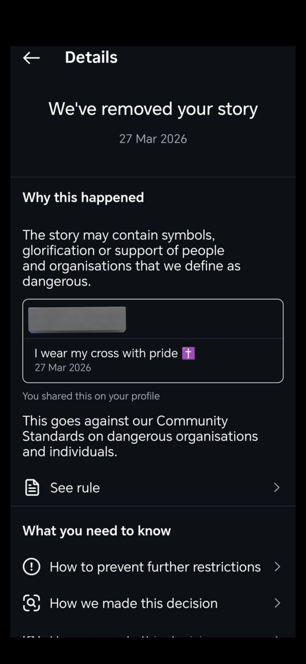Instagram censors story highlighting Christian pride: The X user Warwatcher shared screenshots showing that the user’s March 27 Instagram story which included a post captioned “I wear my cross with pride ✝️” was removed by the platform. “The story may contain symbols, glorification or support of people and organisations that we define as dangerous,” Instagram wrote. “This goes against our Community Standards on dangerous organisations and individuals.” The platform then provided examples such as, "Glorifying a terrorist attack," "Supporting violence against a particular group of people," and "Supporting or promoting harmful criminal activity, such as human trafficking."