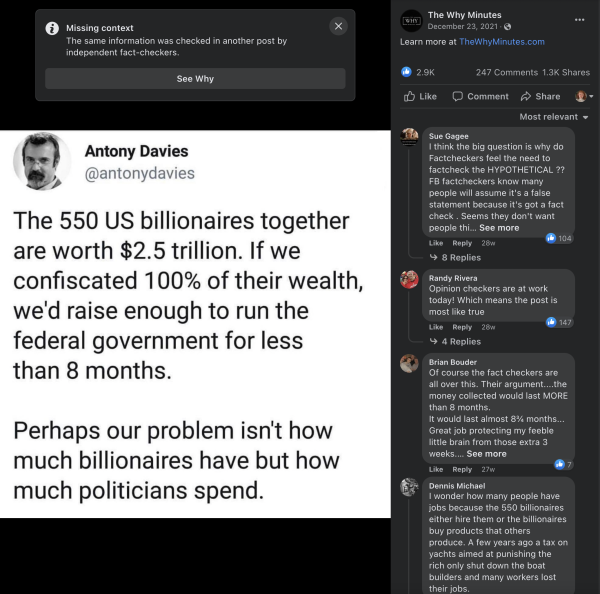 Facebook fact checks post about government spending: Facebook fact-checked a post criticizing government spending. The post said, "The 550 US billionaires together are worth $2.5 trillion. If we confiscated 100% of their wealth, we'd raise enough to run the federal government for less than 8 months. Perhaps our problem isn't how much billionaires have but how much politicians spend." Facebook claimed the post was "missing context" and linked to an article by independent fact-checkers. Posts with fact checks are negatively affected because users fail to click through a fact-check interstitial to see the post 95% of the time.