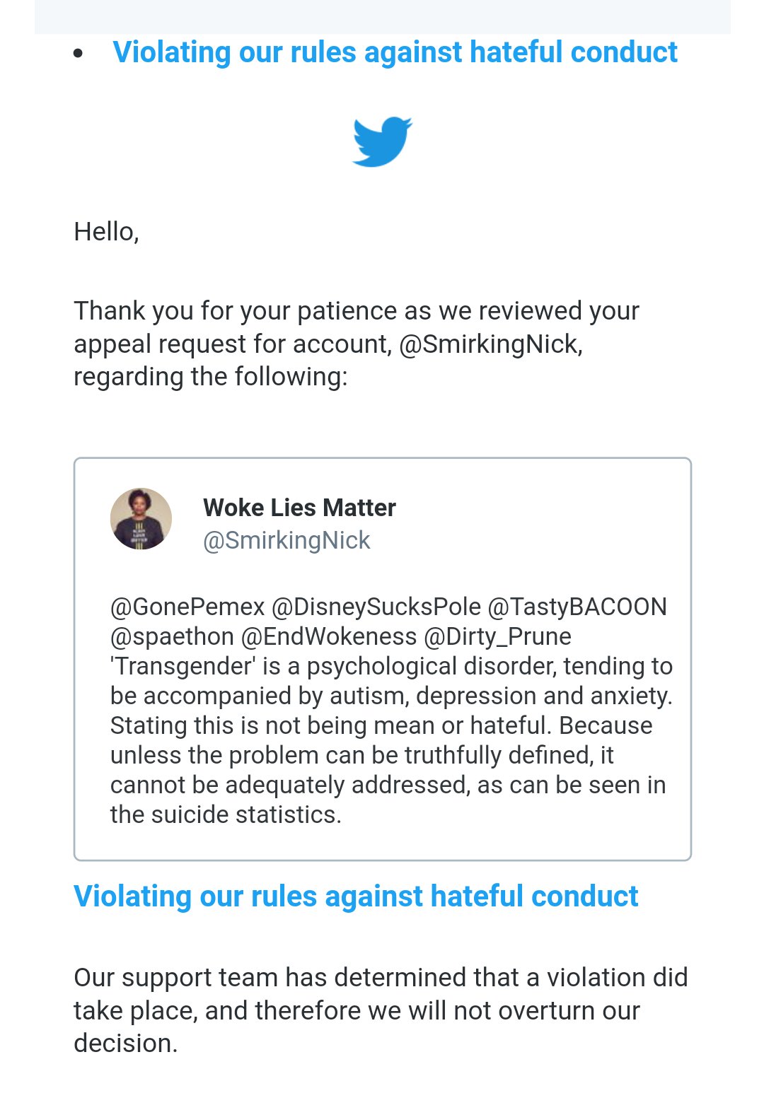 X censors user for post about transgenderism: An X user shared a screenshot of another user's censorship notice. The censored user had posted "'Transgender' is a psychological disorder, tending to be accompanies by autism, depression and anxiety. Stating this is not being mean or hateful. Because unless the problem can be truthfully identified, it cannot be adequately addressed, as can be seen in the suicide statistics." X claimed the post violated its "rules against hateful conduct" and deleted the post. An appeal found that "a violation did take place" and the decision stood.