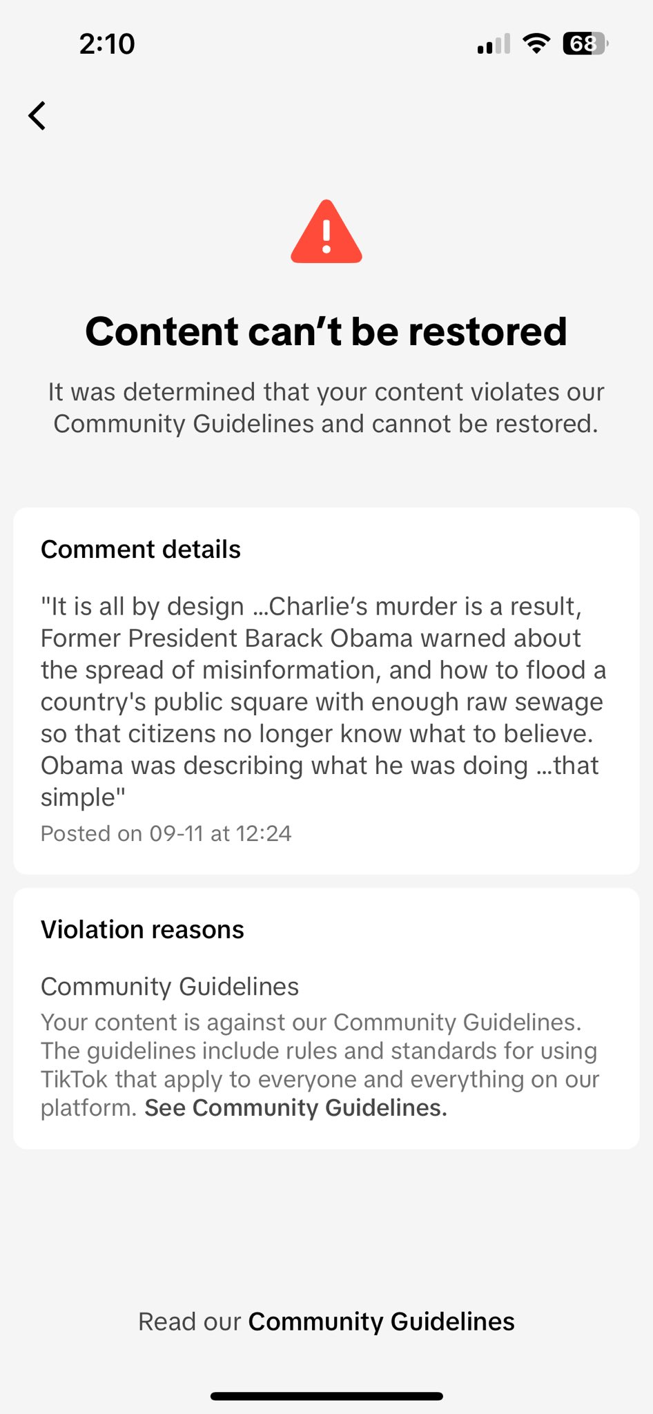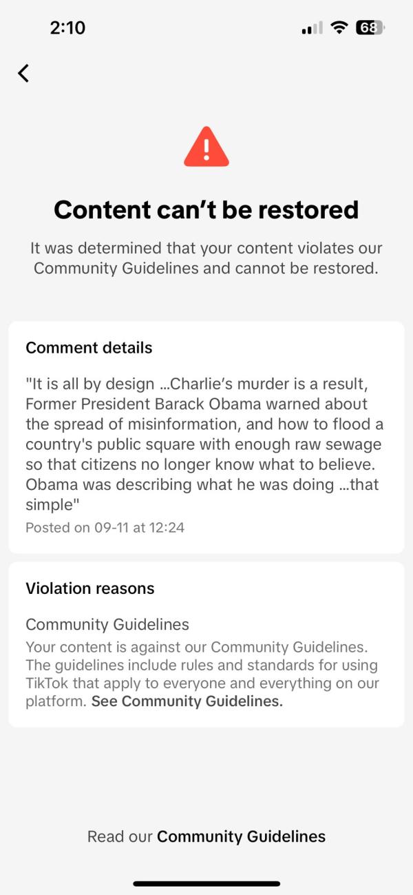 TikTok removes comment about Charlie Kirk's assassination: An X user shared a screenshot of his TikTok censorship notice. The user had posted "It is all by design ...Charlie's murder is a result, Former President Barack Obama warned about the spread of misinformation, and how to flood a country's public square with enough raw sewage so that citizens no longer know what to believe. Obama was describing what he was doing ...that simple." TikTok removed the comment, citing only that it went "against our Community Guidelines."
