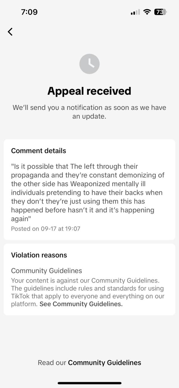 TikTok removes comment about Leftist ideology: An X user shared a screenshot of his TikTok censorship notice. The user had posted "Is it possible that The left through their propaganda and they're [sic] constant demonizing of the other side has Weaponized mentally ill individuals pretending to have their backs when they don't they're just using them this has happened before hasn't it and it's happening again." TikTok removed the comment, stating that it violated the platform's community guidelines, but did not specify which one.