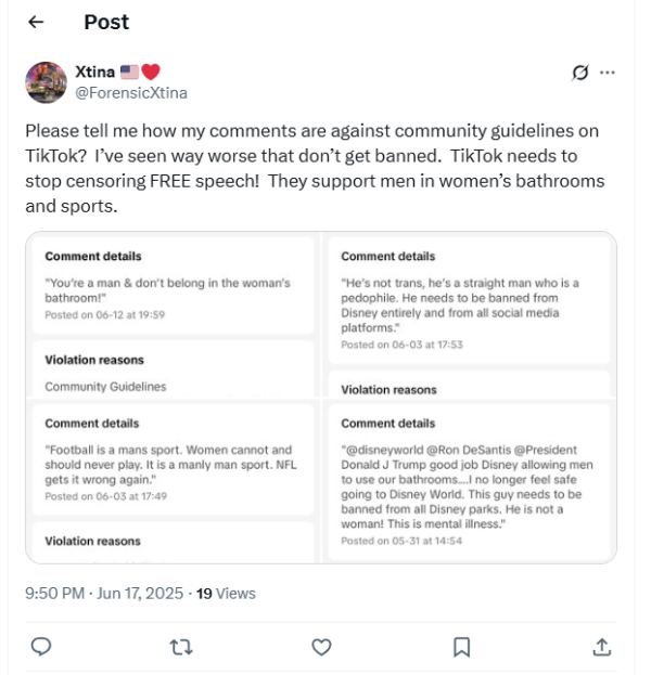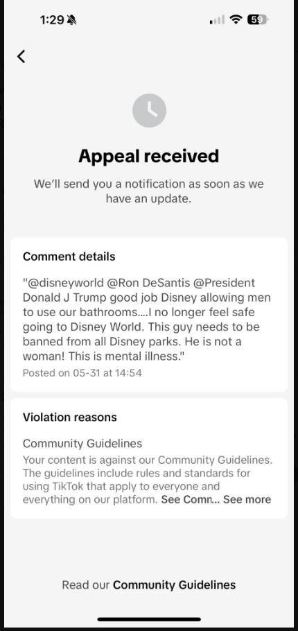TikTok removes user's comment: An X user shared a screenshot of the censorship notice sent by TikTok. The user had commented, "@disneyworld @Ron Desantis @President Donald J Trump good job allowing men to use our bathrooms... I no longer feel safe going to Disney World. This guy needs to be banned from all Disney parks. He is not a woman! This is mental illness." TikTok claimed this comment violated its community guidelines, but did not indicate how. The platform removed the comment. An appeal was requested by the user.