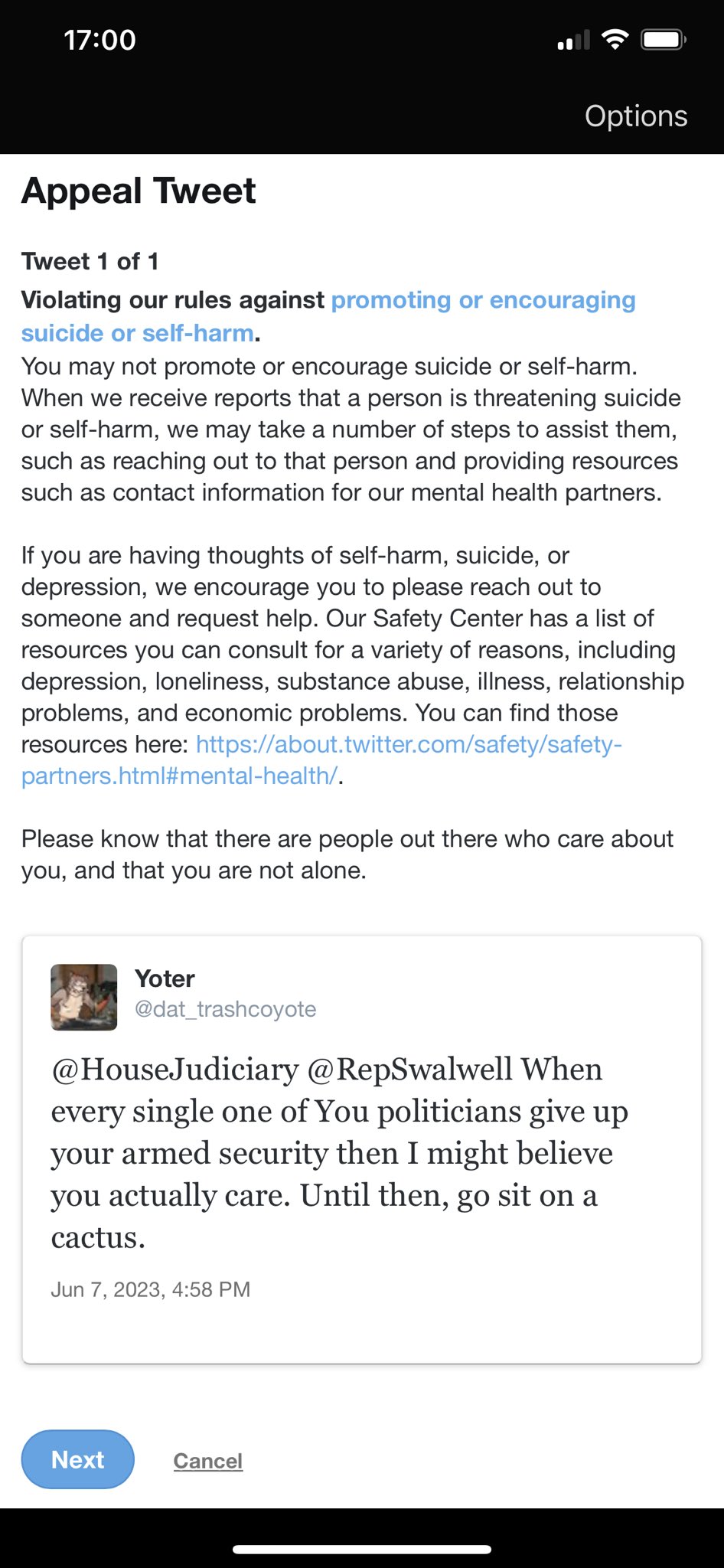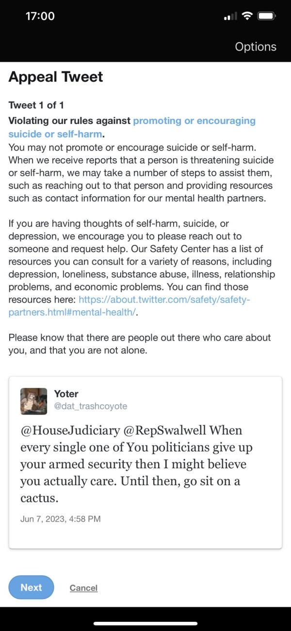 X censors user for post about gun control: An X user shared a screenshot of the user's censorship notice. The user had posted "@HouseJudiciary @RepSwalwell When every single one of You politicians give up your armed security then I might believe you actually care. Until then, go sit on a cactus." X claimed the post violated its "rules against promoting or encouraging suicide or self-harm." The user's account was locked until the post was removed.