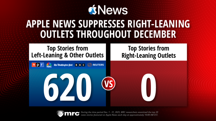 Apple News failed to link to a single right-leaning media outlet among its top 20 daily articles during the month of December. Out of the 620 opportunities analyzed at approximately 10:00 a.m. each day by the Media Research Center, Apple News…